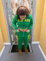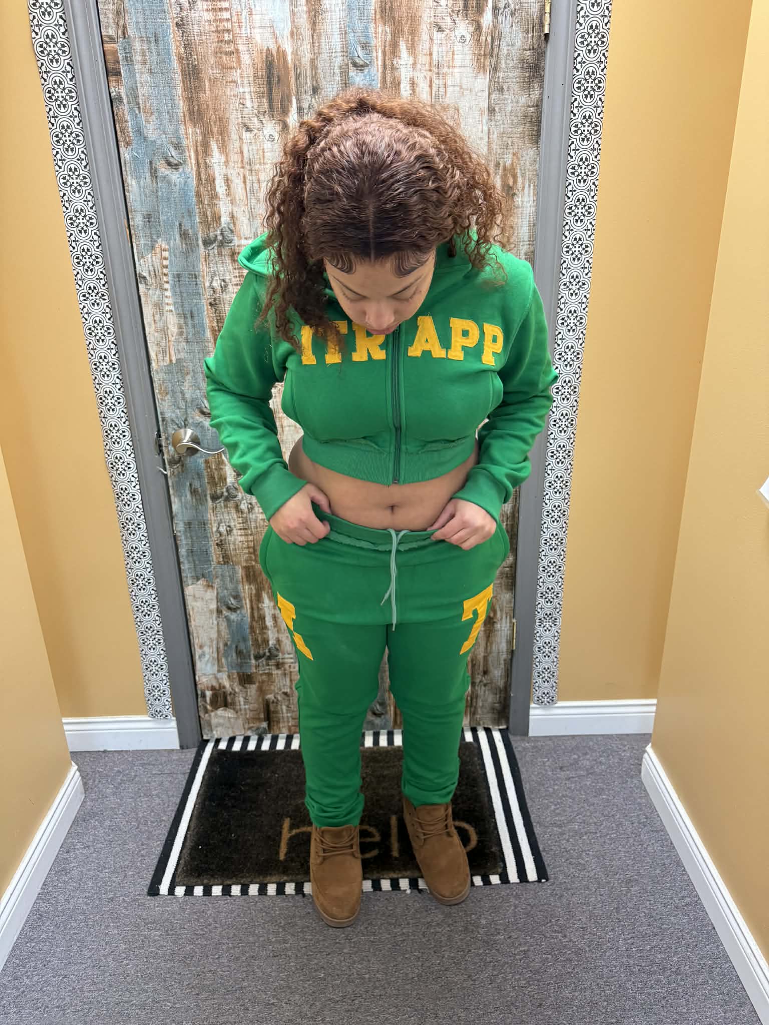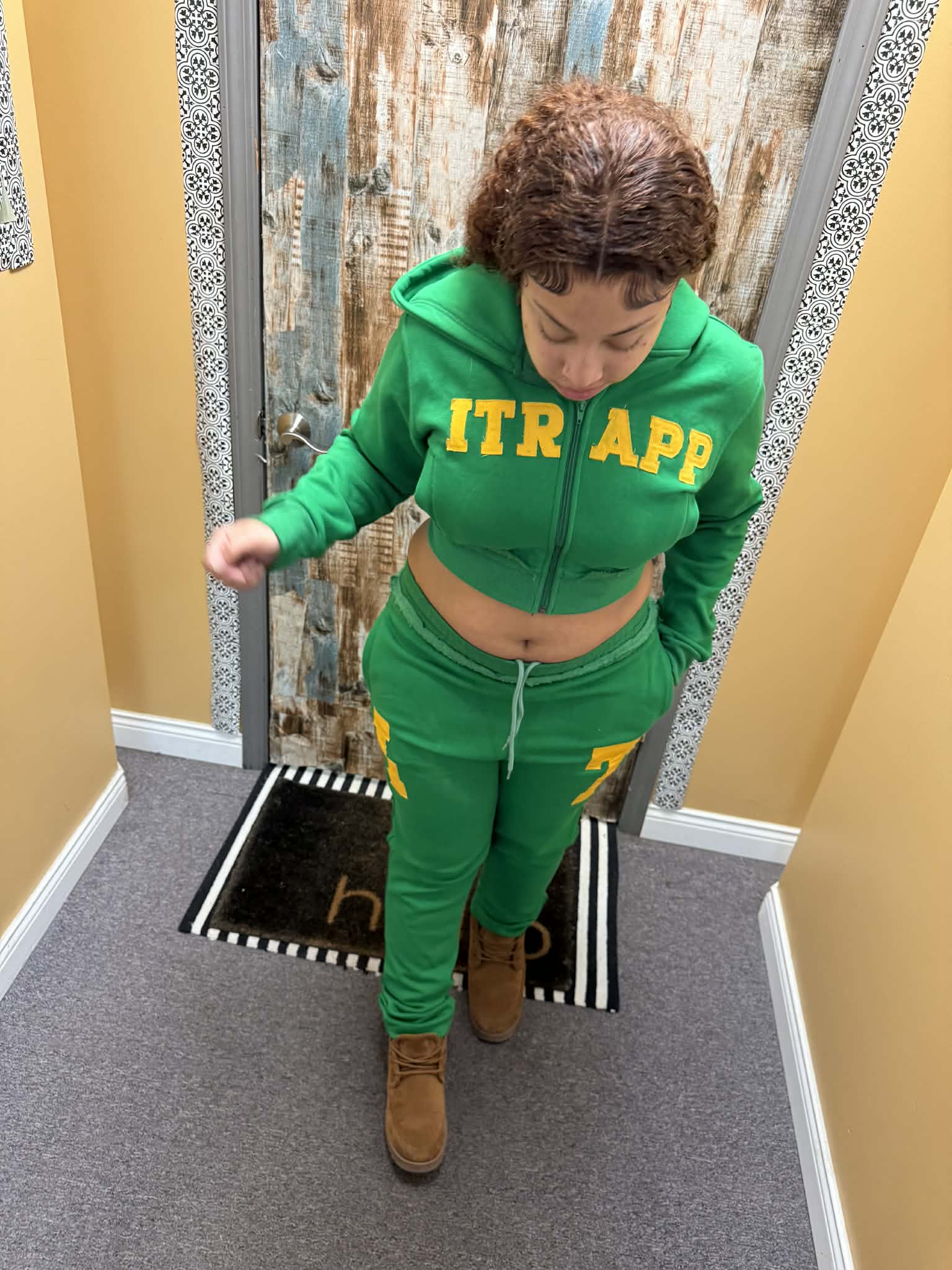 Green sweatsuit with yellow itrapp logo